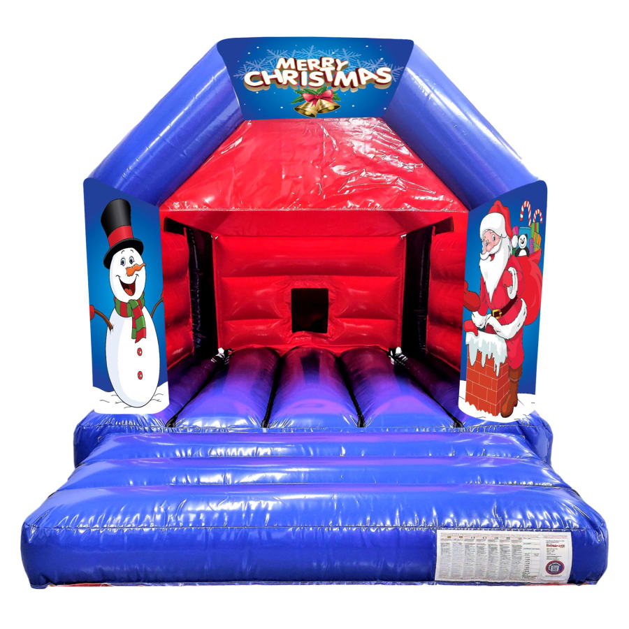 Aim Of The Game: Frolic in festive fun on the "Christmas Santa & Snowman - Blue & Red Bouncy Castle":