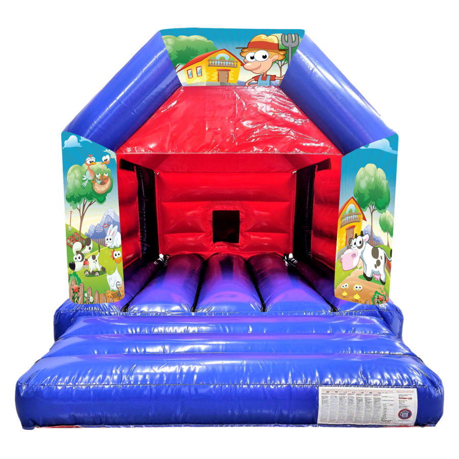 Aim Of The Game: Jump into agricultural adventures on the "12x15 Children's Bouncy Castle Hire - Farm Yard Red & Blue":