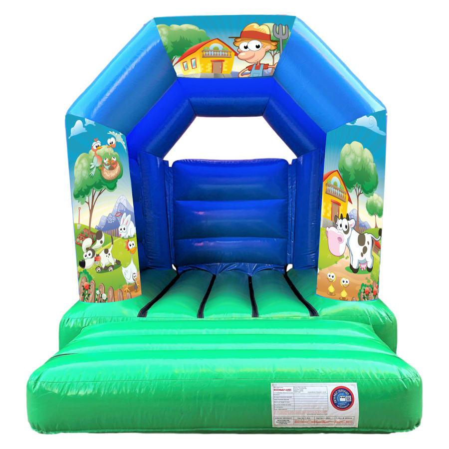 elcome to the charming world of our "Farm Yard Theme Toddler Bouncy Castle - Green & Blue." This delightful bouncy castle, designed in soothing green and blue hues, is perfect for little ones who adore the rustic life of the farm. Featuring adorable farmyard scenes, it's a hit for toddler-friendly activities at birthday parties, playgroups, or family gatherings. Available for hire across Yorkshire, including Bradford, Leeds, Wakefield, Huddersfield, Halifax, York, Harrogate, Sheffield, and Doncaster, and also nationwide for larger rural-themed events. Enhance the farmyard experience with our selection of toddler-appropriate extras like soft play sets, animal hoppers, and diddi cars. For events with a broader age range, our adult bouncy castles and inflatable slides are excellent for a fully immersive and inclusive experience.