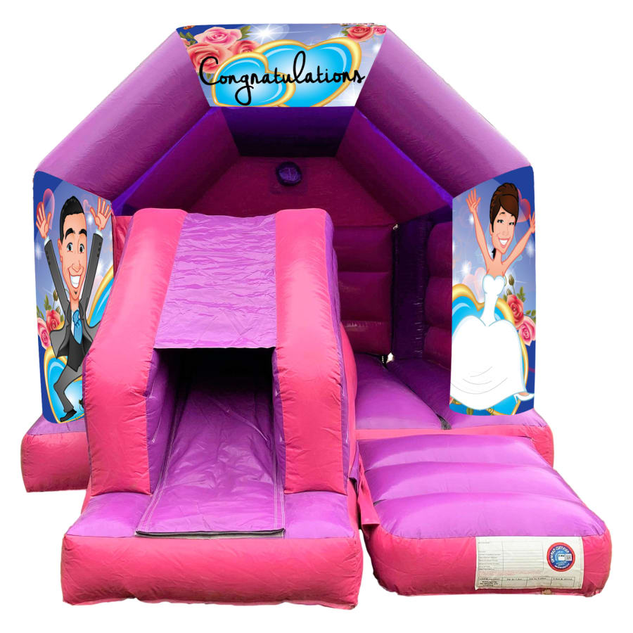 The 12ft x 16ft Wedding themed Bouncy castle with slide hire is a fantastic new addition to our fleet. The Wedding bouncy castle with slide combines 2 of the most popular items we own in one extraordinary inflatable where space is at a premium. The bouncy castle with slide combo is the perfect combination slide for any party, venue or occasion and is ideal for all age groups. This brightly coloured piece of equipment provides the perfect bouncing area to bounce along with friends, whilst the slide provides entertainment for the rest of the guests at the same time and certainly won't break the bank.