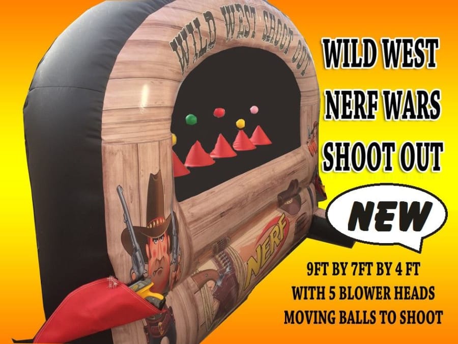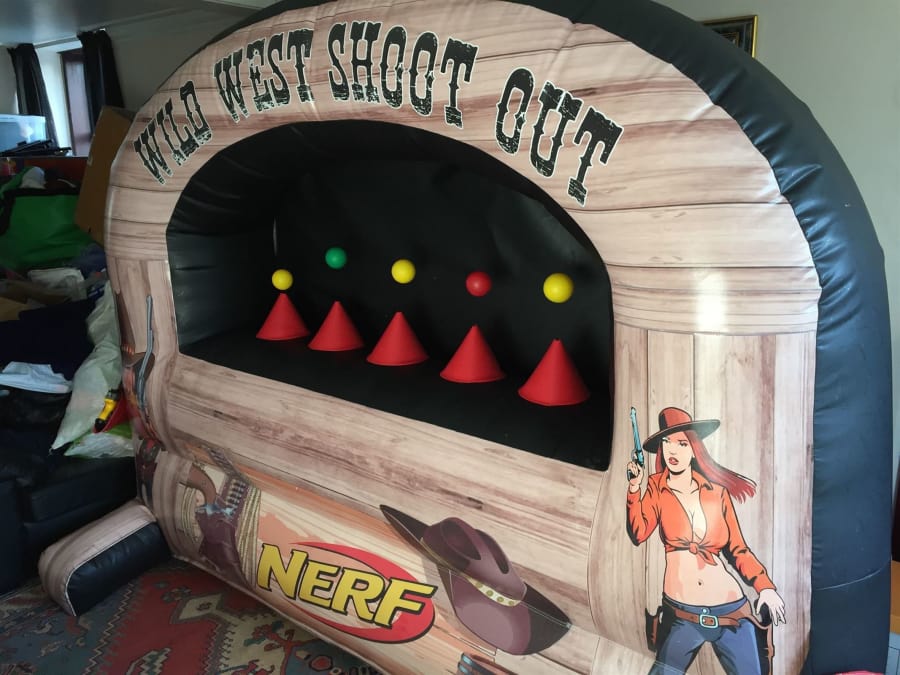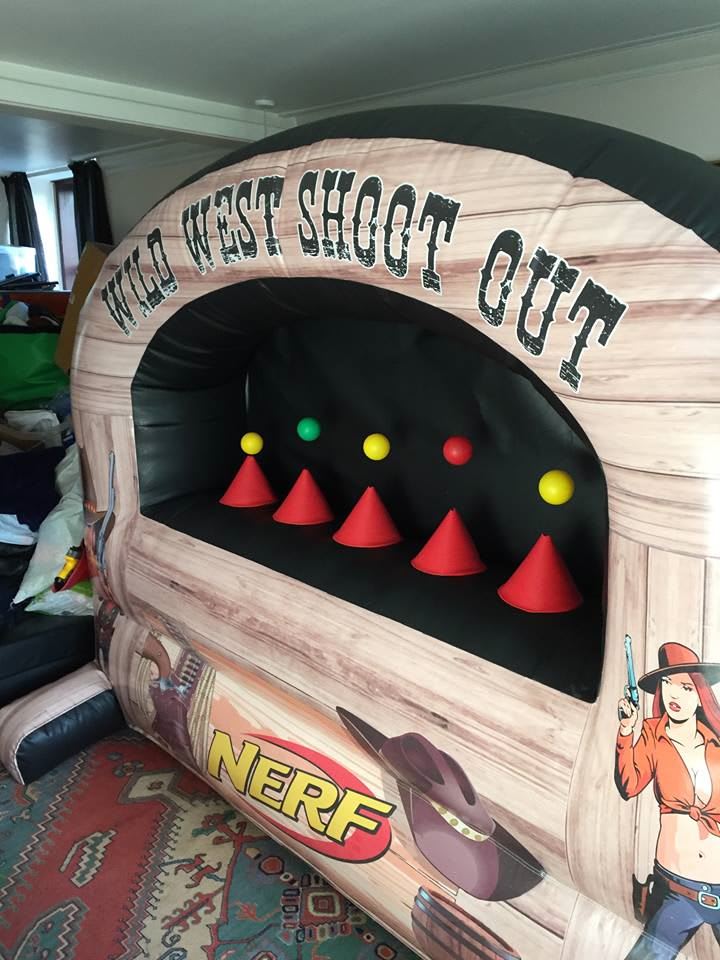 This season welcomes one of the hottest new games on the market. The Wild West nerf shootout wall built specifically for us in our own top secret manufacturing facility at www.better-bounce.co.uk. The all new nerf shooting game is a modern twist on an old school favourite cork gun range/ Tin can alley but much safer. The inflatable tin can alley is a fantastic way to draw in additional visitors to your event, fete, fair, school gala, pub, club, shopping centre or simply for a bit of light-hearted fun at a private party event or birthday bash. It's a fantastic team game and can be extremely competitive for all three shooters.