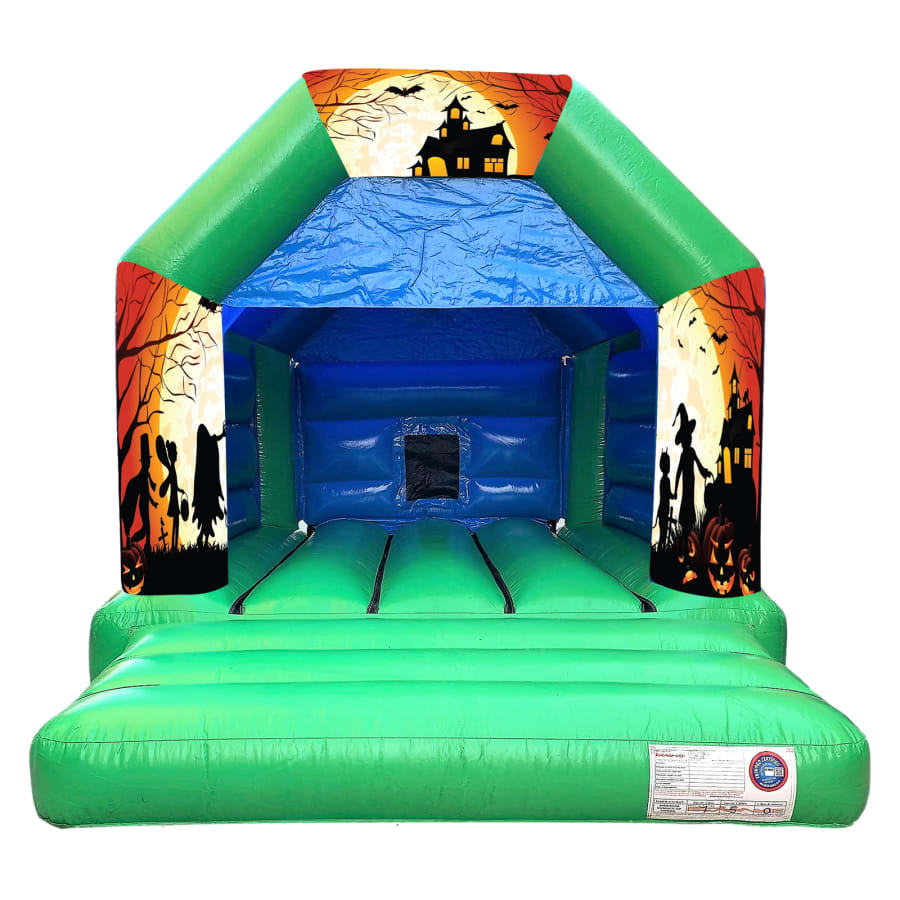 - 1 x 12x15 Children's Bouncy Castle Hire - Halloween Silhouette Green & Blue