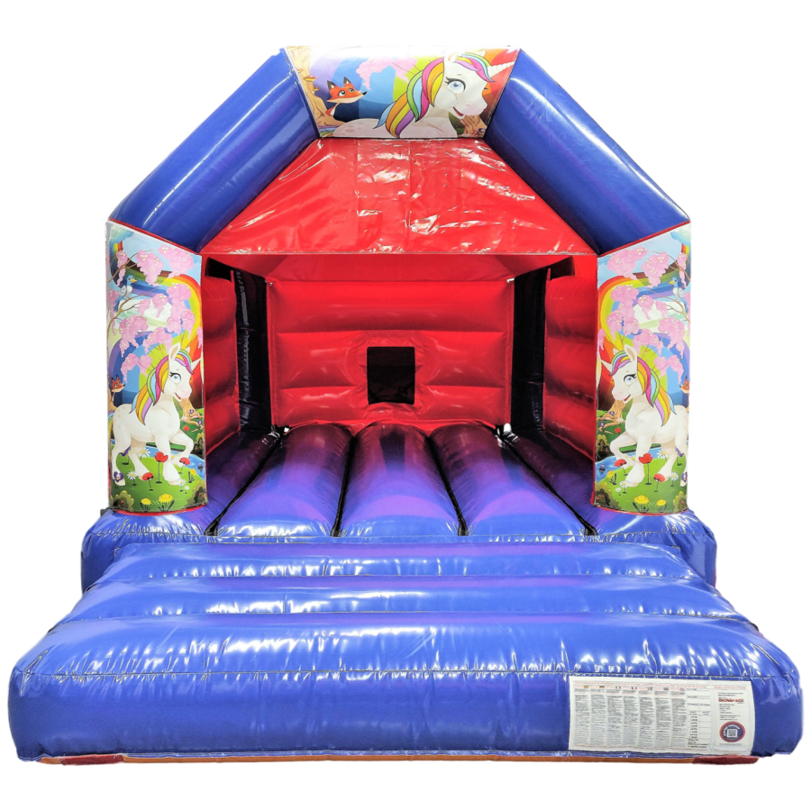 - 1 x 12x15 Children's Bouncy Castle Hire - Unicorn Forest Red & Blue
