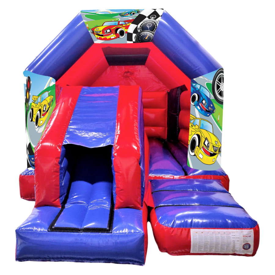 The 12ft x 16ft Cars themed Bouncy castle with slide hire is a fantastic new addition to our fleet. The Cars bouncy castle with slide combines 2 of the most popular items we own in one extraordinary inflatable where space is at a premium. The bouncy castle with slide combo is the perfect combination slide for any party, venue or occasion and is ideal for all age groups. This brightly coloured piece of equipment provides the perfect bouncing area to bounce along with friends, whilst the slide provides entertainment for the rest of the guests at the same time and certainly won't break the bank.