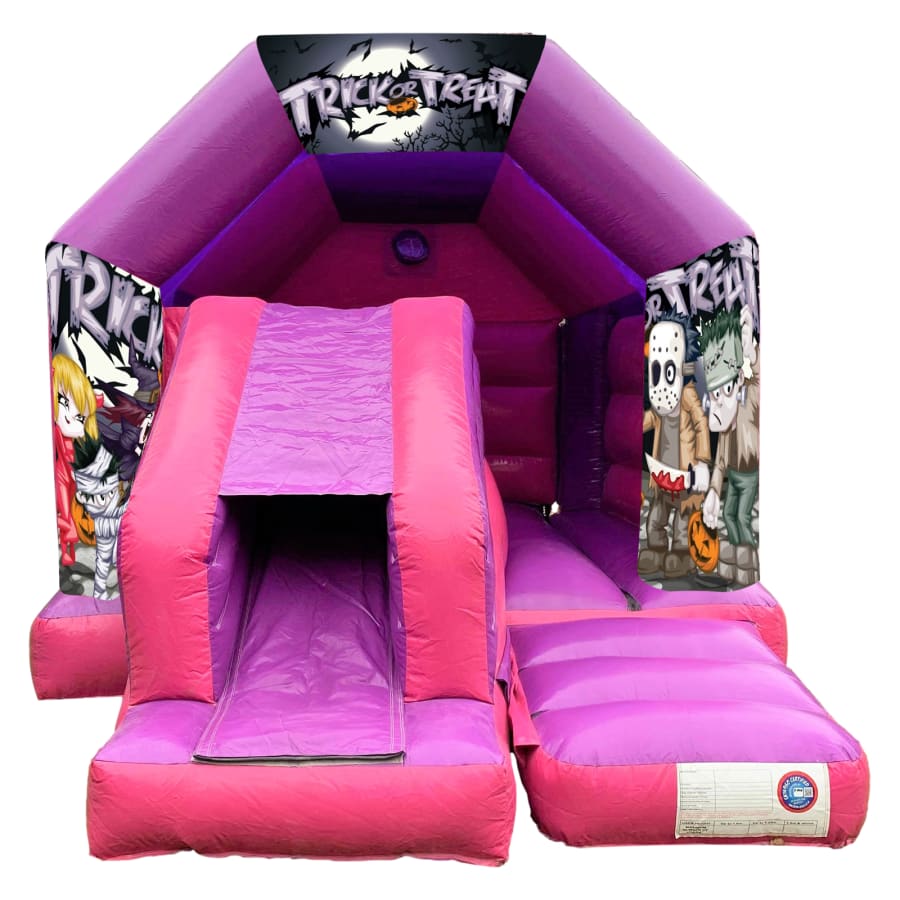 The 12ft x 16ft Halloween themed Bouncy castle with slide hire is a fantastic new addition to our fleet. The Halloween bouncy castle with slide combines 2 of the most popular items we own in one extraordinary inflatable where space is at a premium. The bouncy castle with slide combo is the perfect combination slide for any party, venue or occasion and is ideal for all age groups. This brightly coloured piece of equipment provides the perfect bouncing area to bounce along with friends, whilst the slide provides entertainment for the rest of the guests at the same time and certainly won't break the bank.