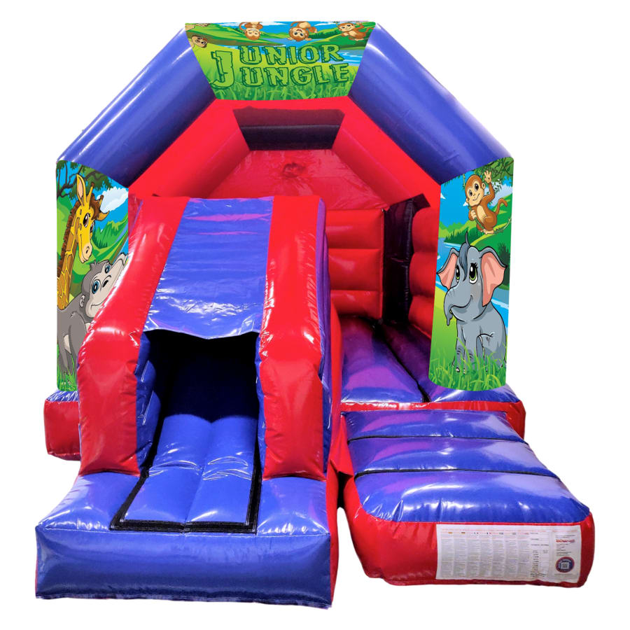 The 12ft x 16ft Jungle themed Bouncy castle with slide hire is a fantastic new addition to our fleet. The Jungle bouncy castle with slide combines 2 of the most popular items we own in one extraordinary inflatable where space is at a premium. The bouncy castle with slide combo is the perfect combination slide for any party, venue or occasion and is ideal for all age groups. This brightly coloured piece of equipment provides the perfect bouncing area to bounce along with friends, whilst the slide provides entertainment for the rest of the guests at the same time and certainly won't break the bank.