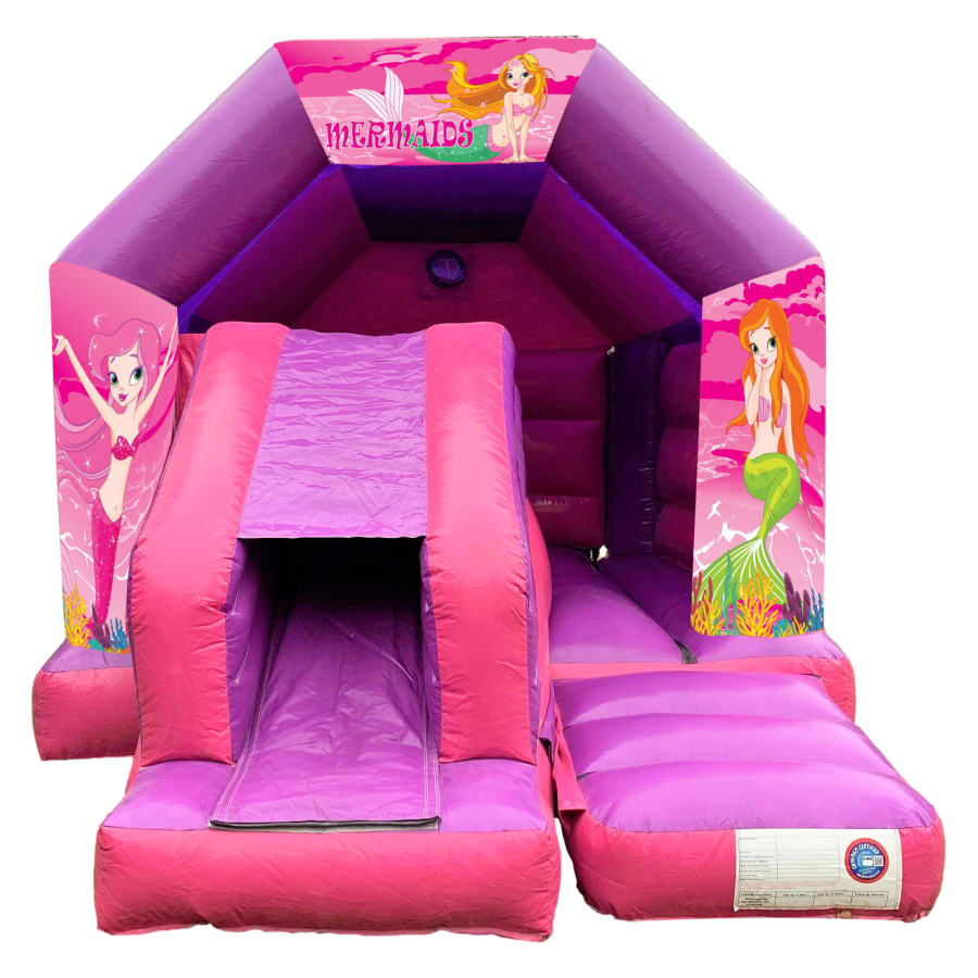 The 12ft x 16ft Mermaid themed Bouncy castle with slide hire is a fantastic new addition to our fleet. The Mermaid bouncy castle with slide combines 2 of the most popular items we own in one extraordinary inflatable where space is at a premium. The bouncy castle with slide combo is the perfect combination slide for any party, venue or occasion and is ideal for all age groups. This brightly coloured piece of equipment provides the perfect bouncing area to bounce along with friends, whilst the slide provides entertainment for the rest of the guests at the same time and certainly won't break the bank.