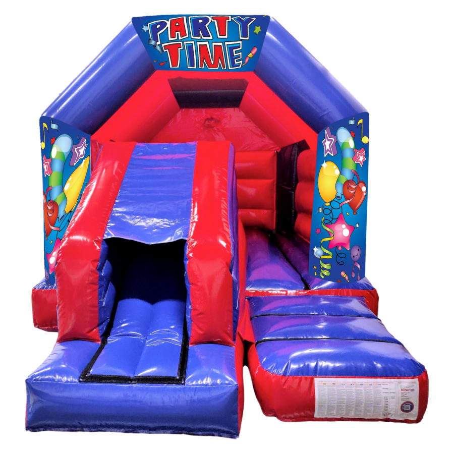 The 12ft x 16ft Partytime themed Bouncy castle with slide hire is a fantastic new addition to our fleet. The Partytime bouncy castle with slide combines 2 of the most popular items we own in one extraordinary inflatable where space is at a premium. The bouncy castle with slide combo is the perfect combination slide for any party, venue or occasion and is ideal for all age groups. This brightly coloured piece of equipment provides the perfect bouncing area to bounce along with friends, whilst the slide provides entertainment for the rest of the guests at the same time and certainly won't break the bank.