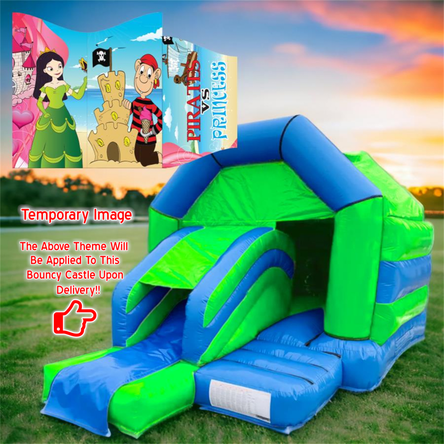 12x16ft Bouncy Castle Slide Combo Hire - Pirates vs Princess Theme - Green & Blue: A Fairy Tale Adventure Awaits with FunBounce Entertainments!