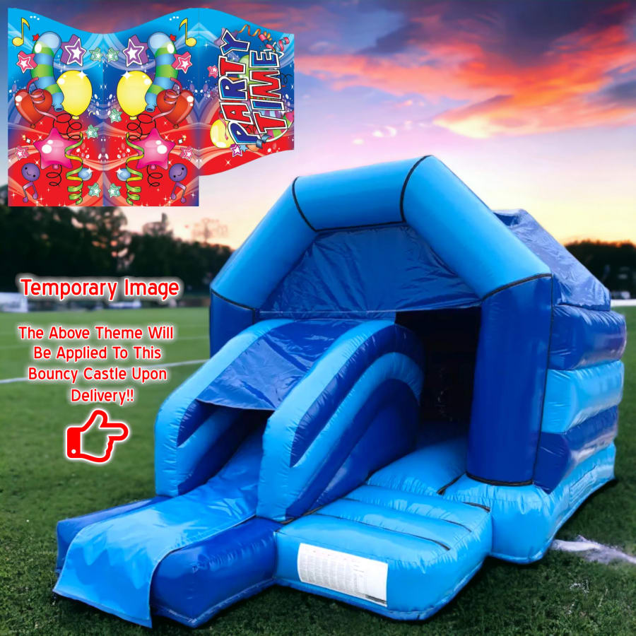 Choose the 12x16ft Bouncy Castle Slide Combo - Party-Time Theme in Blue & Light Blue for your next event. It's more than just a bouncy castle; it's a celebration in itself. Book now with FunBounce Entertainments and turn your event into a memorable party extravaganza, whether you're in one of our key areas or elsewhere in the country!