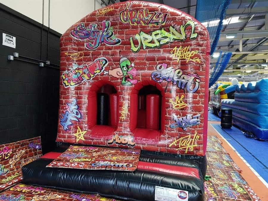 The Graffiti inflatable obstacle course hire measure in at whopping 125ft in length yet is perfect for both indoor and outdoor hire. 75ft is already one of the longest obstacle course in the country and can be extended to 4 5 or even 6 parts if required. This particular 5 part version is absolutely fantastic and is the latest theme from our high adrenaline games range making it the perfect choice for your event. The overall height is only 12ft so its still suitable for large school sports halls, gymnasiums and large venues.The netted sides make parent or guardian supervision easy and ensure the users can be seen from all angled of the party or event for maximum safety.