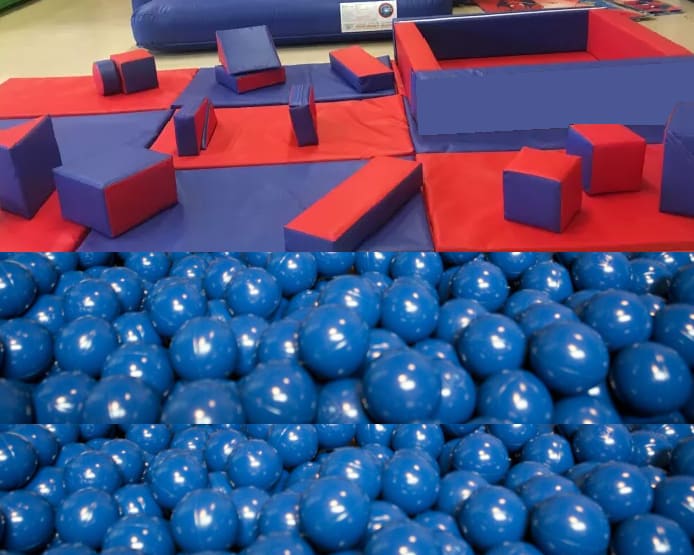 The Colourful Red & Blue soft play package for hire includes a 17 piece soft play set, a 5ft foam padded ball pool, 500 play balls, all set up on a giant padded mega mat for extra safety.